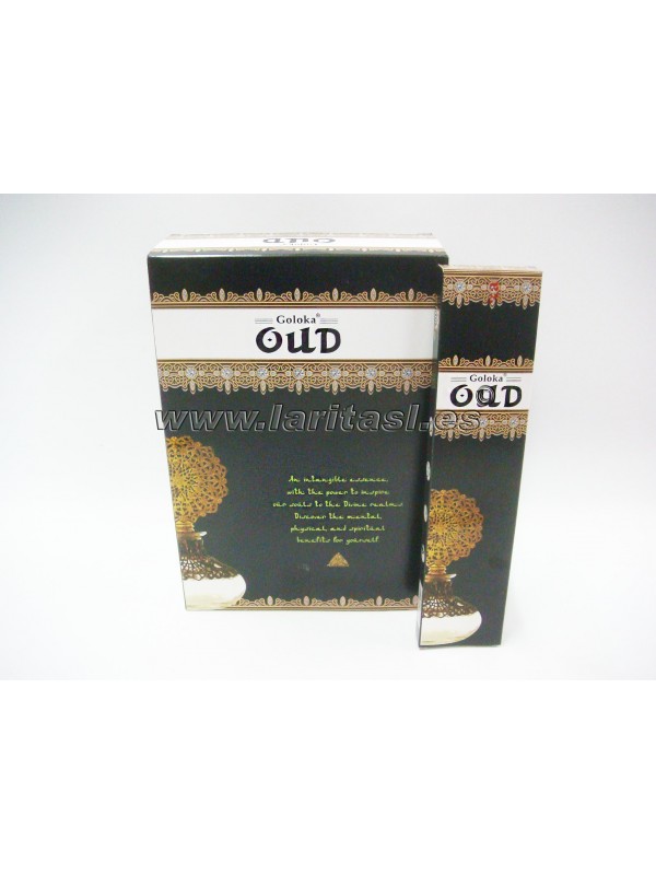 Incienso de la casa Goloka en calidad premium masala. Oud es uno de los aromas más caros y deseados en la alta perfumería. Se ha empleado durante siglos en India, Sudeste Asiático y Oriente Medio Tiene un aroma parecido al musk pero más intenso. El Oud se obtiene del árbol del agar.