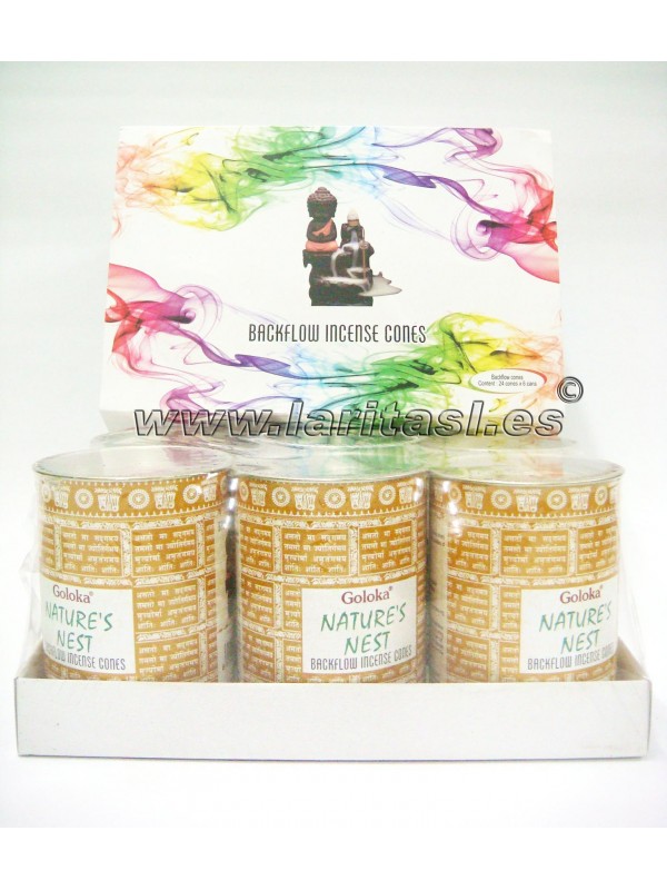 Inciensos de reflujo de la casa Goloka con la misma fragancia que los inciensos Goloka Nature´s Nest. Se presentan lata con 18 conos. Cada cono tiene una duración aproximada de 20 minutos.