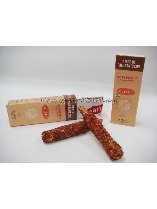 Atado/sahumerio de palosanto (Bursera Graveolens) con Rosa (Rosa Centifolia). Mide unos 9cm de largo y tiene un grosor de casi 2cm en total. (medidas aproximadas).